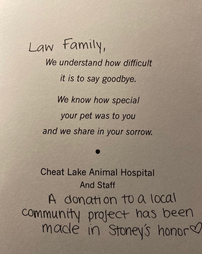 Please see the lovely note we received from our veterinarian clinic that cared for Stoney below. It meant more to us than I can say. Vet clinics are faithful about sending condolences. The message including a donation in Stoney’s honor really touched our hearts.